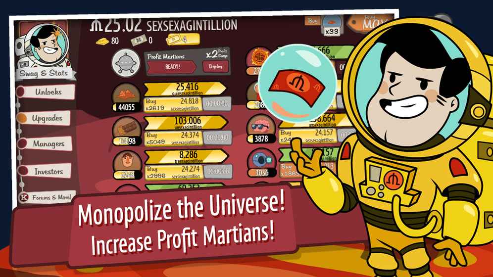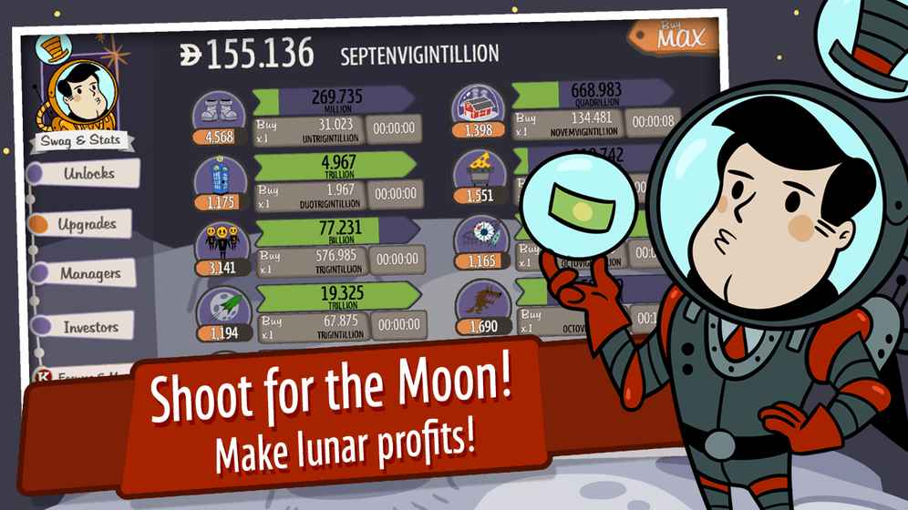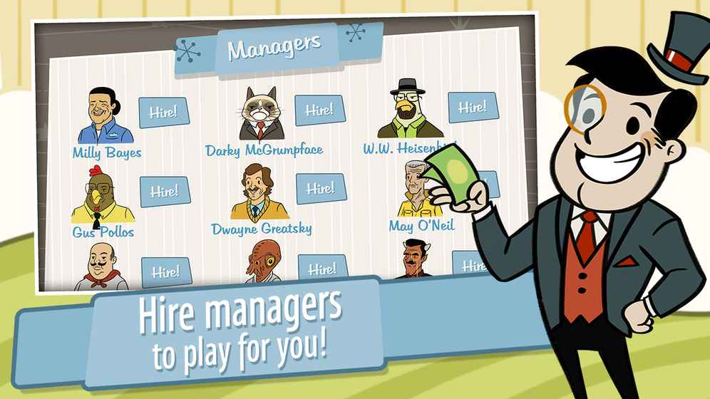雇佣员工,购买顶尖科技升级,征服市场,吸引天使投资人来增加你的收益!唯一的道路就是上上上!
