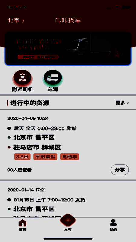咔咔找车是一款非常实用的手机货运软件,在这款软件上,用户可以在咔咔找车app里发布自己的常用路线,轻松找货,货主可以在咔咔找车app里发布货源,轻松找车。感兴趣的话,咔咔找车app是一个与车相关的信息平台,咔咔找车app拥有国内百万司机和上千万的货源,咔咔找车app涵盖小面包车、金杯、厢式、大卡等各种车长车型,满足各类货运用户的用车需求。