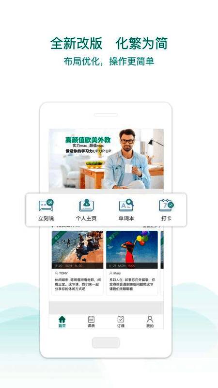 立刻说app是面向所有行业,针对各年龄段人群,自主研发的专业课程的在线英语学习平台。量身定制个性化课程,为学员制定详细的学习计划,一对一教学。立刻说(原美联在线)隶属于美联国际教育集团,是国内领先的在线学习品牌。凭借着10年专业的语言培训经验,同时借助互联网优势,打破了时间与空间对学习的限制,为广大英语学习者与爱好者,提供了24小时/365天不间断的真人在线英语培训产品与服务。