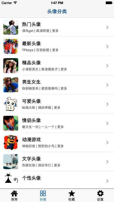 3、提供多种分类,类别清晰明确,快速找到自己的爱好。让你的头像与众不同,个性十足。