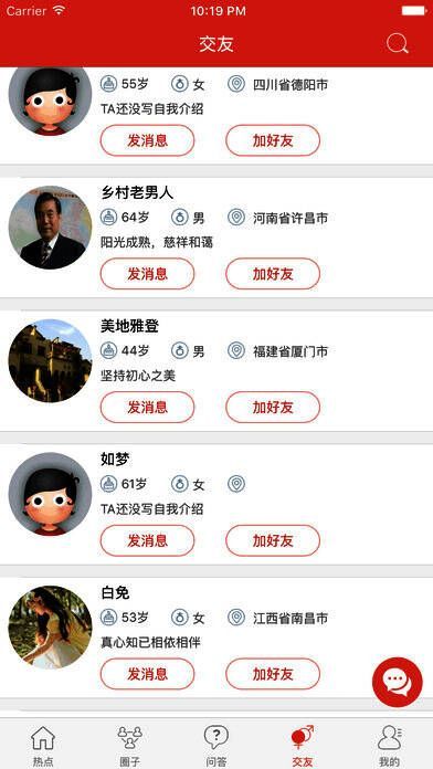 4、交友版块用户注册资料后,可根据性别、年龄、地区等各种搜索条件,查看其他会员的资料和相片,寻找你要找的那个他(她),实时通讯功能方便中老年朋友交流,系统所有功能模块均为免费使用。