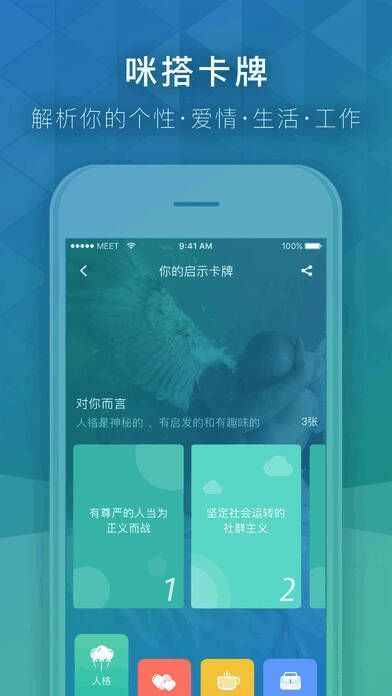 这款《咪搭》APP是社交类;该软件的最迷人色彩就是塔罗牌可预测你下一个TA是谁,也可预测目前各种情况。个性名片功能彰显个性突出自我,找寻未来的那个TA。
