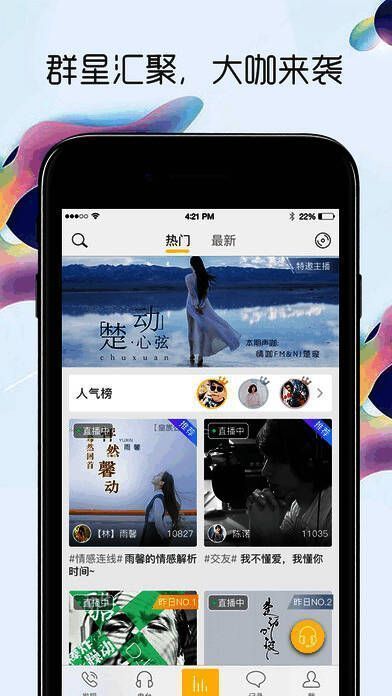 超轻松有内容的声音直播!24小时不间断,与偶像主播零距离连麦对话。声音的魅力,此刻尽显;