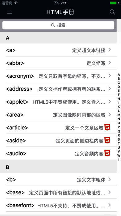 《HTML5手册》本app是一个HTML语言参考手册,收录了全部的HTML标签,包含HTML5;