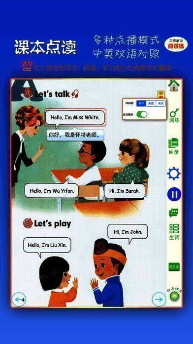 2、强大的点读机:课文全文点读。朗诵者为外籍播音员,语音纯正。课本上所有的内容字均可点读发声:字母、单词、句子,对话、文章。