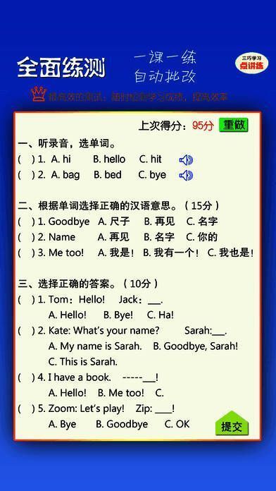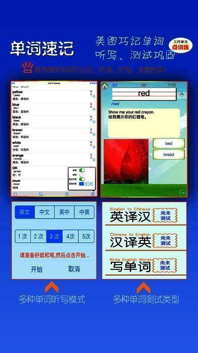 4、最佳的单词记忆法:融合三巧学习原创的“全息速记法”,帮助小学生速记单词。单词学习内容包含:听读英语单词、听写英语单词。单词测试题型包含:英汉互译、英语单词拼写。