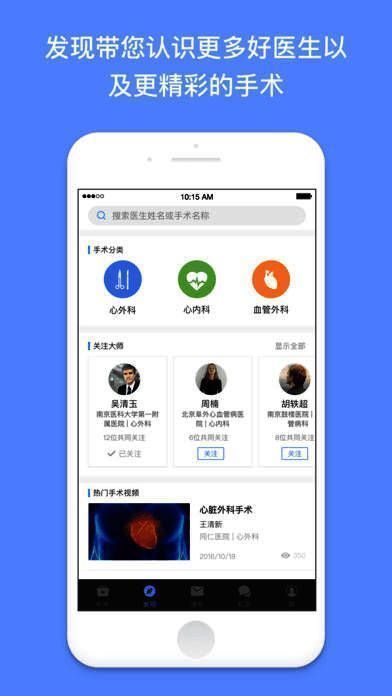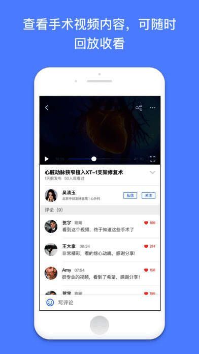 2、同科室的医生可通过关注方式,关注各地的名医,并且查看关注的名医发布的手术,选择要观赏哪一个手术影片。医生或医学院学生在看完影片之后,可以发布评论,发布手术的医生可以依据评论内容进行回复。除此之外,医生还可以将影片分享到微信或新浪微博,让更多各地的医生或学生加入到手术大师的行列;