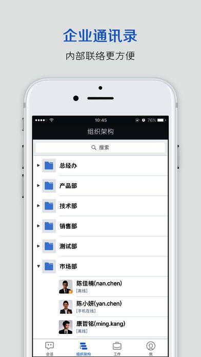 3、组织架构,把企业通讯录装在手机里,找人更容易;
