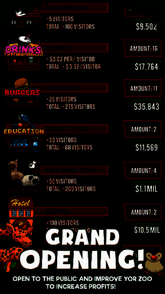 管理一个动物园并不容易,除了伺候好动物们,还要准备娱乐设施(比如小吃摊,周边店)来招待顾客。在游戏中,你的动物园将不断成长,为你赚钱,你可以用钱来解锁像猴子、熊猫、大猩猩和狮子这样的新动物!