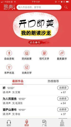 寻声朗读app是一款时尚的配乐诵读录音软件,用户可使用寻声朗读app自由录制并发布喜欢的内容,还能在寻声朗读app聆听其他人发布的作品。寻声朗读app是公司与全国数十所知名学校达成朗读联盟合作战略,推出的手机应用软件,共同追求看得见的朗读成长。寻声朗读校园版app专注于朗读文化传播与朗读教育推广,愿景是用朗读打造人们更加美好的生活。