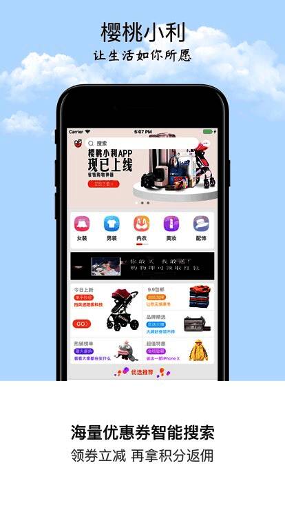 樱桃小利app是一款非常实用的网购省钱应用,帮助您能够更实惠的进行网购哦。拥有其他购物商城的优惠券,以及全网收集的各类精美产品,团购、特价抢购、还能有返利佣金拿,更多精彩好礼。轻松的通过搜索即可领取,体验大超大的折扣力度,樱桃小利app,为你提供了多种省钱购物方案,优惠多多,折扣多多,更有海量精选折扣商品等你来!樱桃小利app,让你生活称心如意。