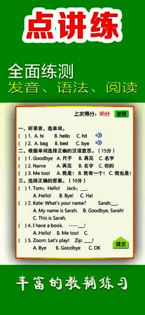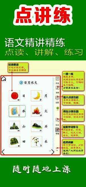 针对中小学语数外教材的手机点读软件,内容跟教材一致,使用起来就像直接在教材上使用一样。《三巧点讲练》App,“教”和“学”完美融合的点读学习机平台。《点讲练》学习效果好,远超普通点读机!深度讲解单词,包括读音、记法、用法;全面讲解课文难句、重点、语法;准确翻译课文;详尽解析课文练习,提供标准答案。《点讲练》的英语老师为外国语大学教授,发音标准,讲解深入浅出,所讲知识点易学易懂易记。