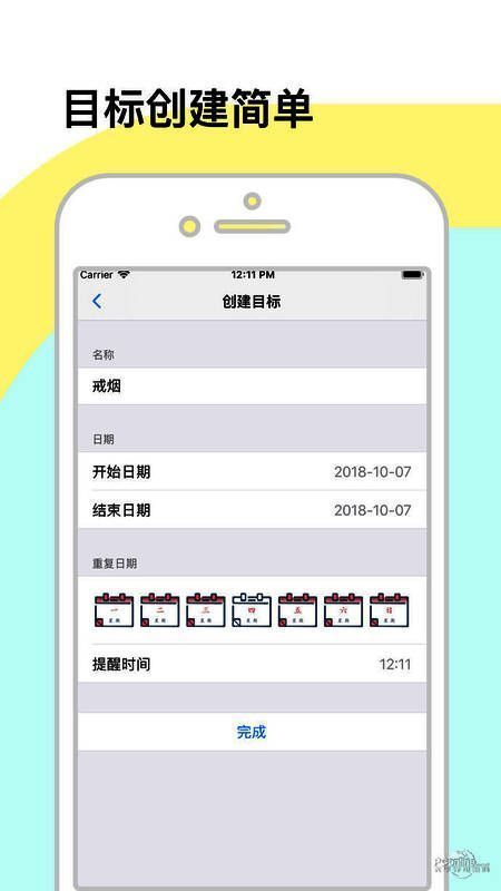 1、创建目标,包括设置目标的时间段,目标的提醒日期和重复日期,目标的名称。