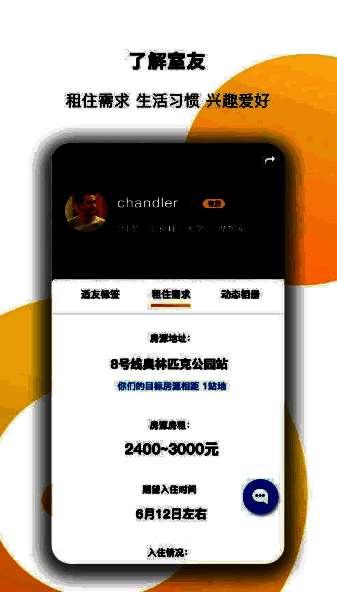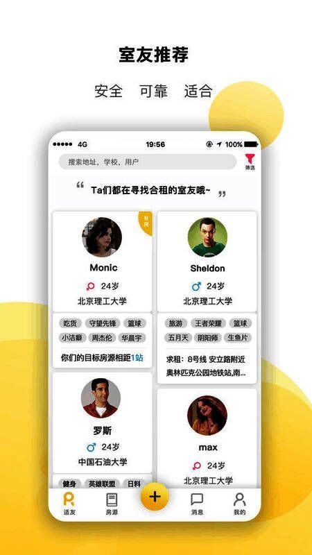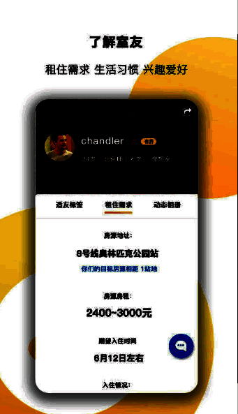 根据你的租住需求,生活习惯,兴趣爱好,适友会智能为你推荐需求相近,志趣相投的合租室友,从此不用在论坛里大海捞针。高效找到合租另一半。