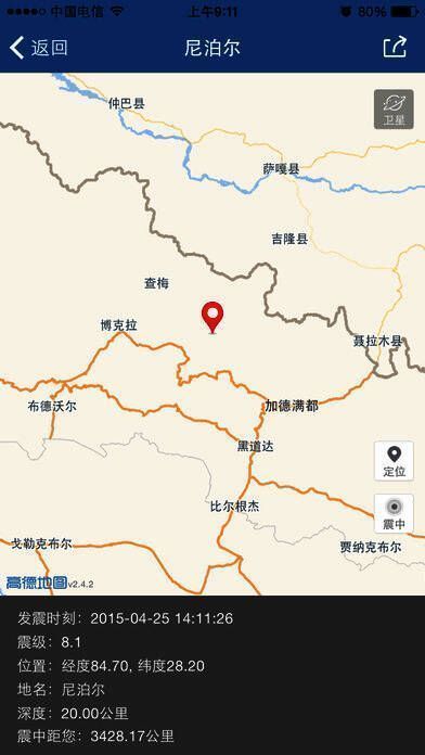 4、用户可通过地图查看震中的详细行政信息,以及震中附近的县城、医院和学校等的分布情况;
