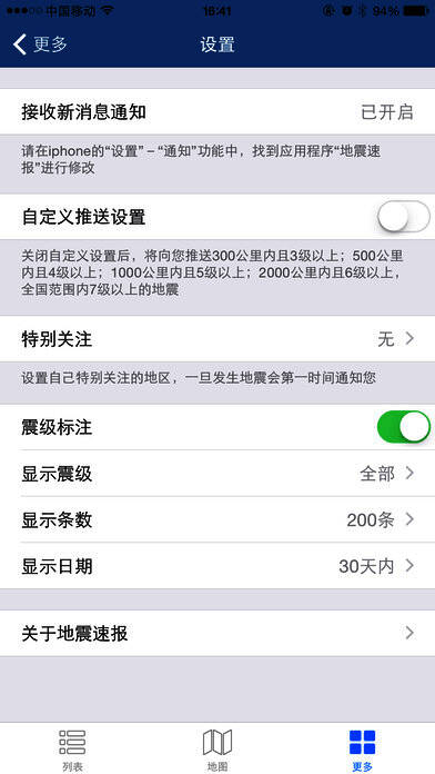 1、根据用户自定义(或系统默认)实时推送国家地震台网发布的最新地震信息;
