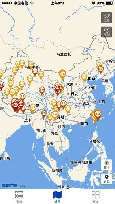 3、地震列表上的所有地震可以定位到地图上,震级大小和发震时刻通过标注符号区分;