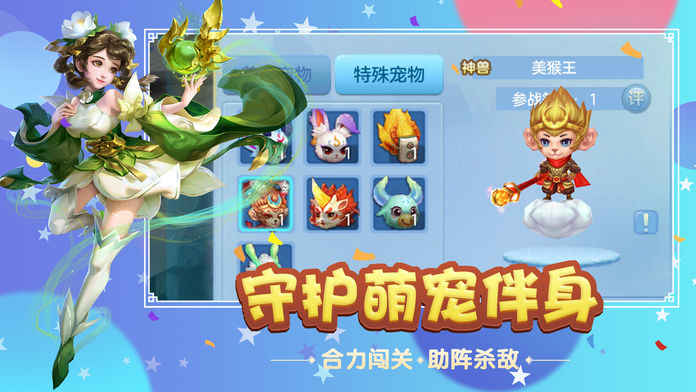 2、神宠助阵,伙伴同行,回合战斗有策略;