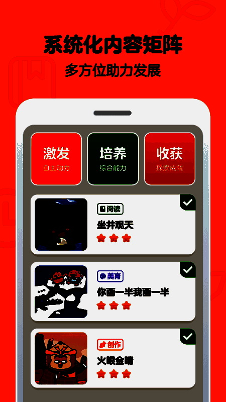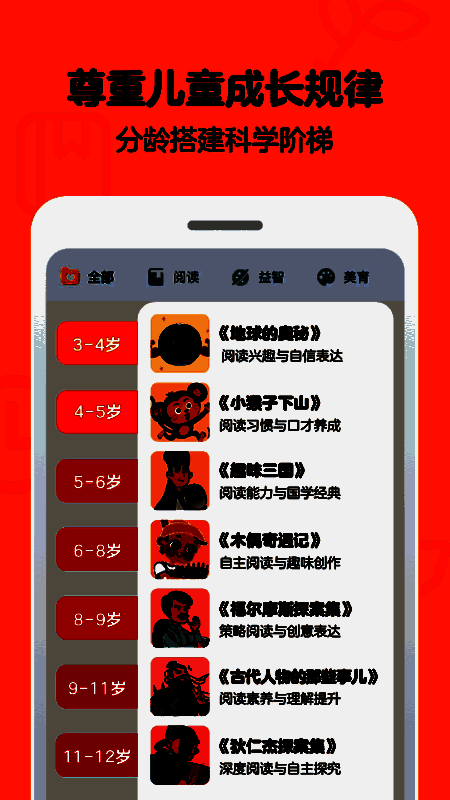 【叫叫】模块通过多样化的阅读内容激发孩子的求知欲;【阅读与思考】则以阅读为基础,培养孩子的核心素养,包括人格塑造、行为规范、科学思维等,并提升其阅读、思维与表达能力;【产品理念】强调尊重儿童成长规律,制定科学阅读计划,重视阅读体验与成就感,帮助孩子养成自主阅读的好习惯。