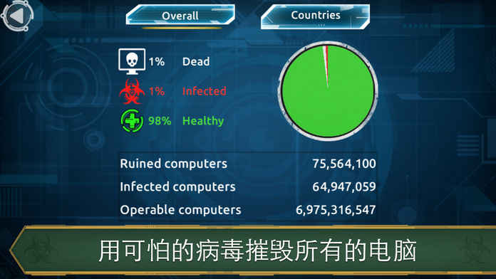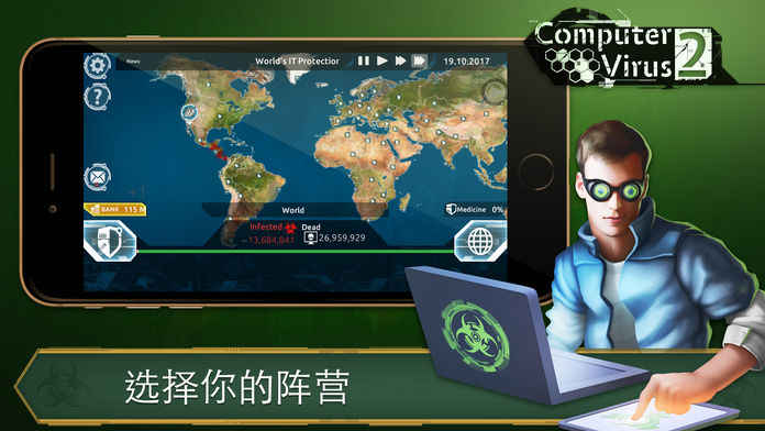 选择你的立场:病毒或杀毒。根据您的选择,任务是用病毒感染所有的计算机,以治疗他们和恢复愈合的计算机系统。用世界地图来控制感染。追踪这个消息,知道世界上发生了什么,电脑瘫痪了。