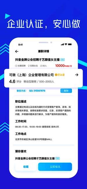 入驻企业实名认证,严格审核企业信息,筛选每个兼职招聘岗位,多种监管机制和保障计划保卫用户权益。