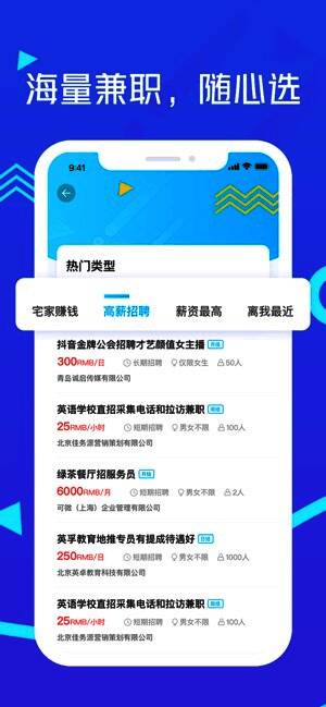 每日提供上千岗位,遍及广州、深圳、上海等热门城市。家教,礼仪,模特,导游,淘宝刷单,美团外卖、饿了么配送员,网红直播,麦当劳服务员,明星助理,健身教练,翻译,设计,策划,文案编辑,保安,京东快递员等职位应有尽有。