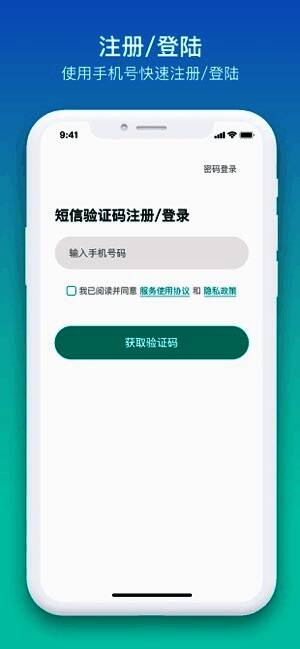 用户在第一次输入手机号后,点击 “获取验证码”,在 60 秒内输入短信获取的验证码,即可注册成功。