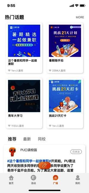 PU口袋校园app这是全民为Pocket University的在线第二课堂的教育应用,是一个专注于高校移动互联网市场,为高校学生提供成长服务的平台。我们的产品主要包含:高校第二课堂、校园金融和创就业等生态服务体系。