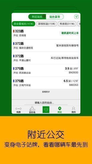 3、对周边地理环境不熟悉的:切换到附近界面,显示离你最近的公交站台,以及经过该站台的所有车辆的实时到站信息,也可以输入