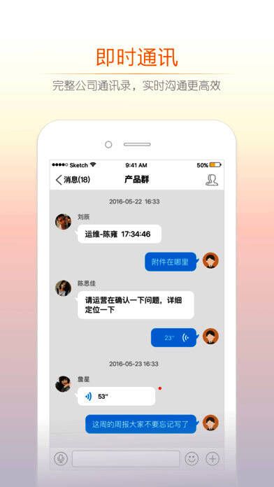 企业员工加入企业后,即可随时随地移动聊天、即时通讯、数据传输,实现移动化办公。