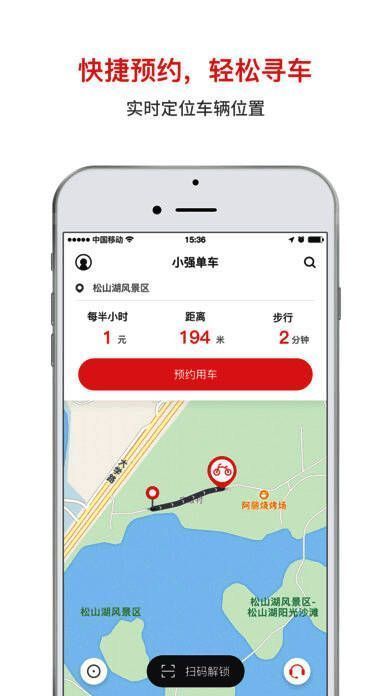 精准地图定位车辆位置,可直接扫码用车,也可预约选择使用车辆。
