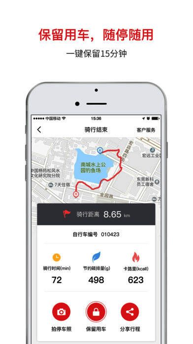 将车辆停在指定停车位置,关锁,即可自动结算车费,轻松归还单车,结束使用。