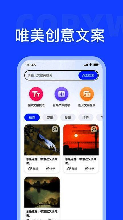 该软件支持热门素材的智能推荐与一键提取音频功能,极大提升了素材利用率。通过“智能测绘”技术,用户只需输入文字或链接即可匹配相关高清图像。图像处理方面,支持任意缩放与手势移动,背景切换也可选择纯色、渐变或模糊效果,增强了视觉表现力。