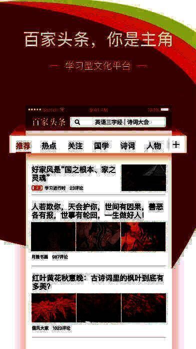 百家头条app是一款十分具有文化气息的手机资讯阅读应用。中国从古至今已有五千多年的历史,历史文化源远流长、博大精深。鼎盛时期当属战国时代,诸子百家争鸣,创造了灿烂的文化艺术。而这款应用则是一个海纳百川的文化平台,致力于传承国学经典,弘扬中华美德,光大百家文化,打造城市名片,提升文化自信,展现中国精神。软件内容丰富多彩,覆盖了海量资讯,包含了国学、诗词、励志、风水、养生等完善的阅读资讯,使用户总能找到自己想要看的,全面用户的日常阅读需求。除此之外,软件支持关注加好友等社交功能,你可以在文章的评论区发表自己的感想,并和好朋友一起欣赏讨论文章。如果你喜欢阅读,那么就赶快下载吧,每天阅读多一点,那么你收获的知识也会更多。