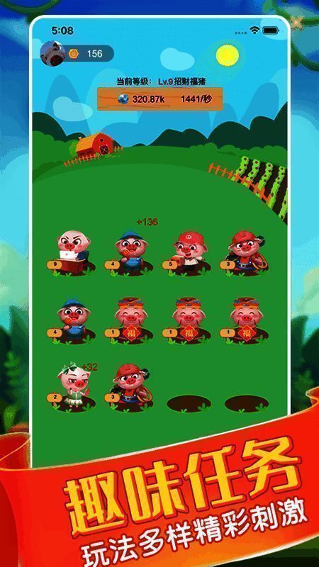 猪不断长大,放松的同时得到更多金币。金币可以买到更先进的仔猪,并与仔猪一起生长。