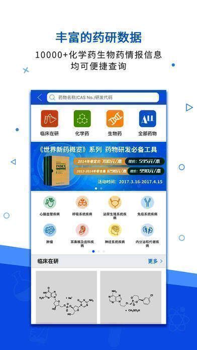 3、数据:为您提供丰富的药研数据,10000+化学药生物药情报信息均可便捷查询,信息包括药品名称、分子结构、作用靶点和临床适应症、研发公司、专利信息、全球销售额、临床用药指导等;