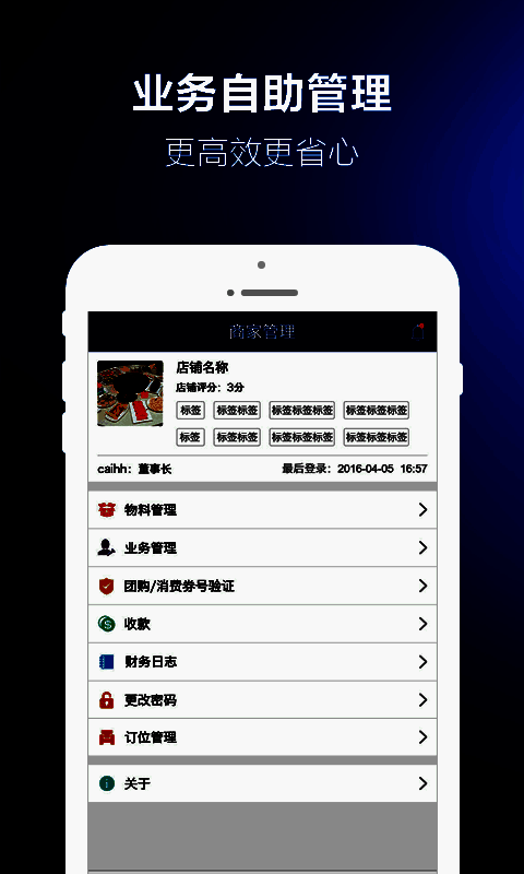 2、房间管理、餐饮管理、外卖管理、团购管理、消费券管理、商品管理、拥有自助调整商家内容权限,实时更新,方便快捷;