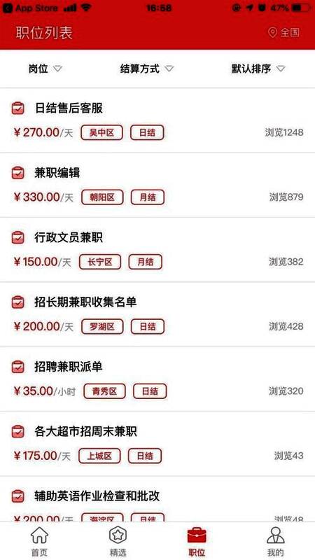 用户可以通过岗位的类型结算的方式等多种方式进行职位的筛选