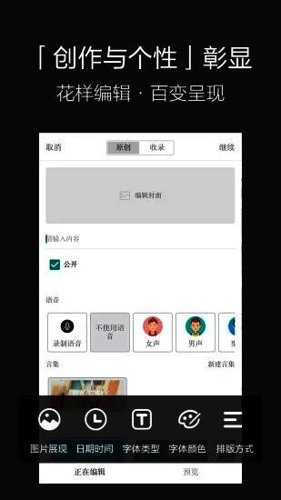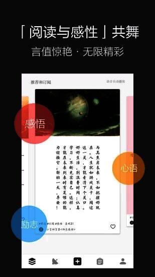 言记是一款具备真人朗读+轻文艺社区。你可以发布或收录唯美/励志/音乐/电影等字句,感受创作之美。通过交流讨论想法/感受,见字如面,发现共鸣之声。一款可以发布和收录原创文字的手机应用,这款软件拥有非常丰富的图文模板,用户可以根据自己的需要来进行自定义,同时还提供了多达十款字体,需要的朋友可以下载言记app进行体验。