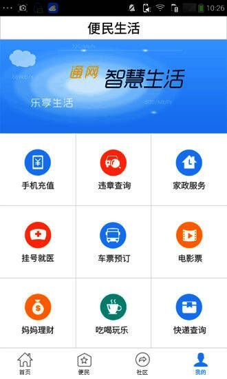 2、便民:提供用户日常便民生活服务,包括手机充值、交通违章、家政服务、挂号就医、车票预订、电影票、妈妈理财、吃喝玩乐、快递查询等;