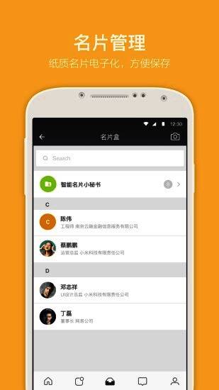 纸质名片电子化,方便管理。智能名片小助手,精确识别纸质名片信息,节省名片整理时间。好友名片更新及时提醒,保持人脉新鲜;