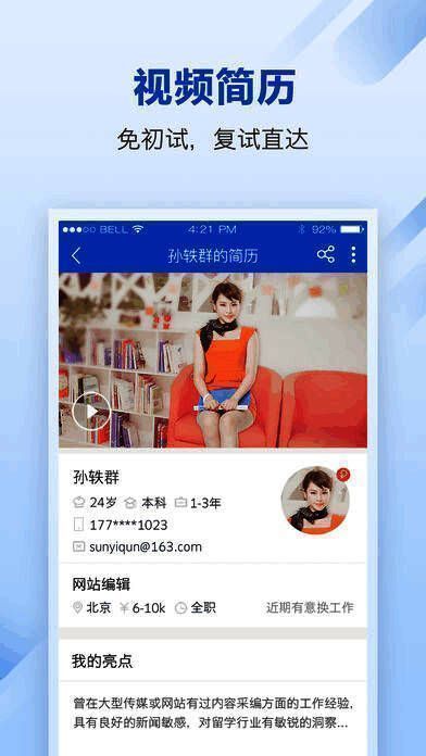 以视频交互为特色的人才筛选服务平台,以短视频的形式让学生免去面试奔波之苦,为企业加快人才筛选,提升招聘效率。