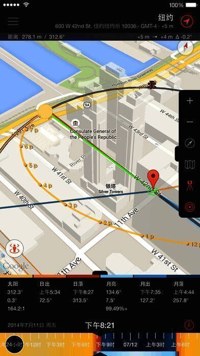 4、地图模式:在可互动的平面地图上显示太阳和月亮的位置。锁定您的摄影地点,然后朝您所要照的太阳或月亮现象对齐。利用新的Google地图API,可查看地形、可旋转地图等。另外,也可查看海拔、计算两个地点的垂直角度差异;