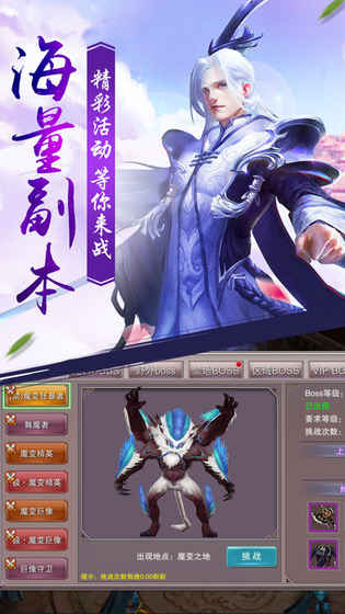 上古凶兽,精英boss,手持仙器统统击之;镇魔塔内降妖除魔,天仙阁里遇神杀神,封神殿内力压群仙;