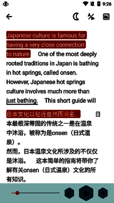 Beelinguapp采用独特的“并排阅读”模式,将双语内容并列呈现,便于用户直接进行语言结构与用法的比对。这一设计不仅增强了语言理解深度,也促进了跨文化认知。