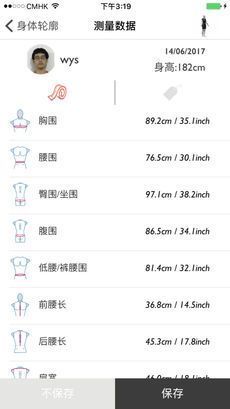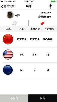4、伙伴们可以保存自己的测量记录,与此同时,根据不同国家的尺码标准,智量体APP为用户提供各国尺码建议;