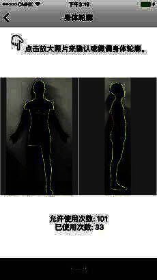 3、首先需要拍照,为了更好的测量身体的准确性,我们需要一张身体的轮廓照,然后就是确认身体轮廓,最后通过三维模型将自己的身体测量数据展示出来;