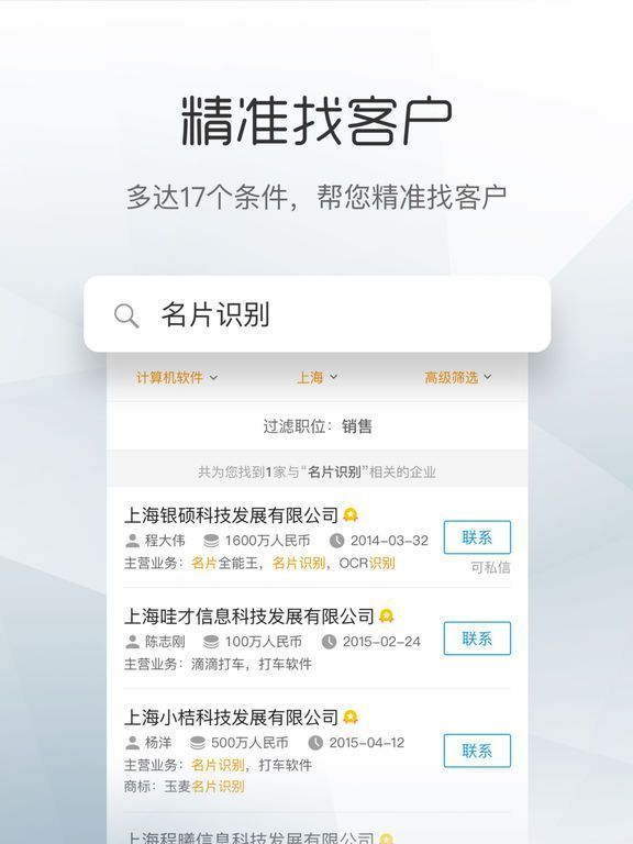 2、【找客户】使用多达17个维度精准筛选企业列表,找客户,找人脉和合作伙伴;