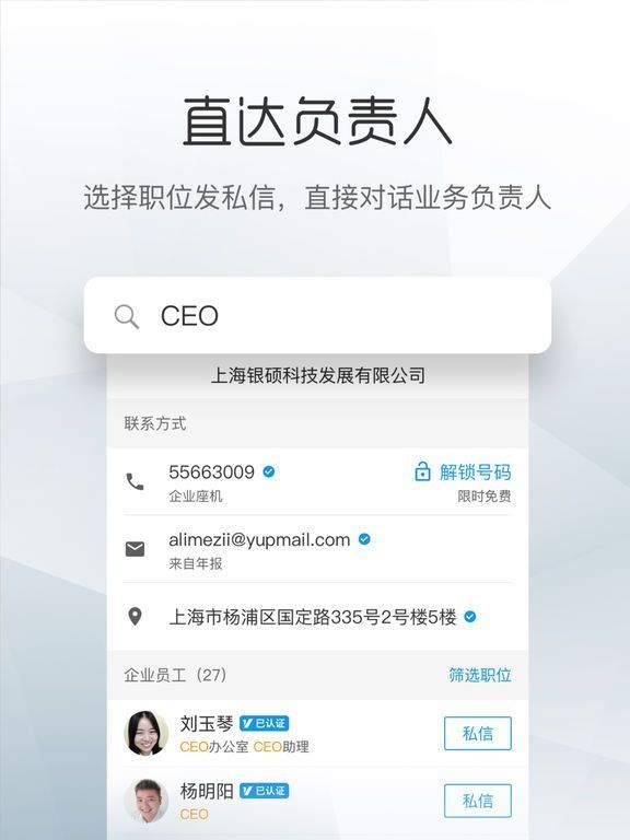 6、批量精准搜人:输入业务、品牌、职能、城市等关键词可批量找到符合条件的企业联系人。