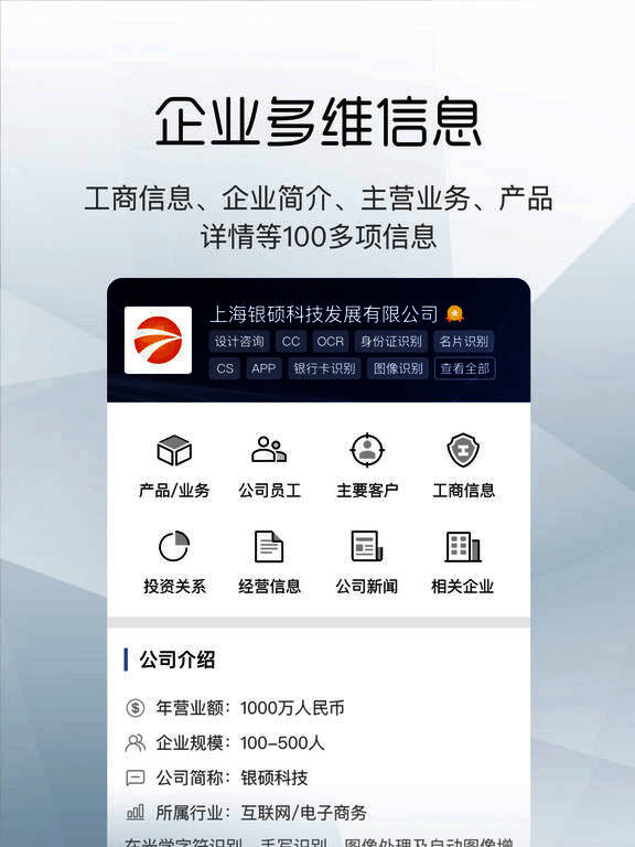 1、【查企业】查询企业介绍、工商信息、主营业务、产品服务详情、联系邮箱、对外电话、商标、专利、招投标、招聘职位等100余项深度信息;